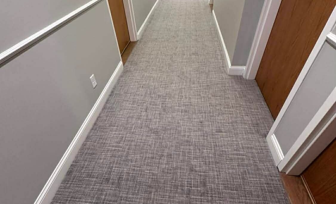 Installation of commercial-grade carpet in an interior hallway
